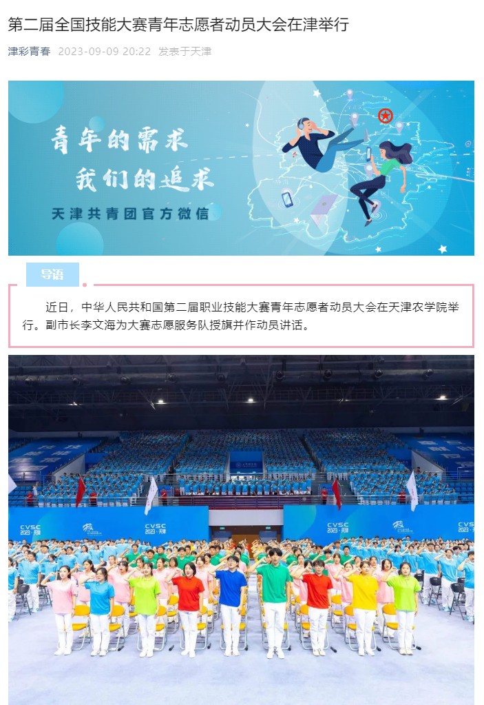 2023年9月9日,共青团天津市委员会官方微信(津彩青春)以《第二届全国技能大赛青年志愿者动员大会在津举行》为题,报道中华人民共和国第二届职业技能大赛青年志愿者动员大会在beat365举行。副市长李文海为大赛志愿服务队授旗并作动员讲话。