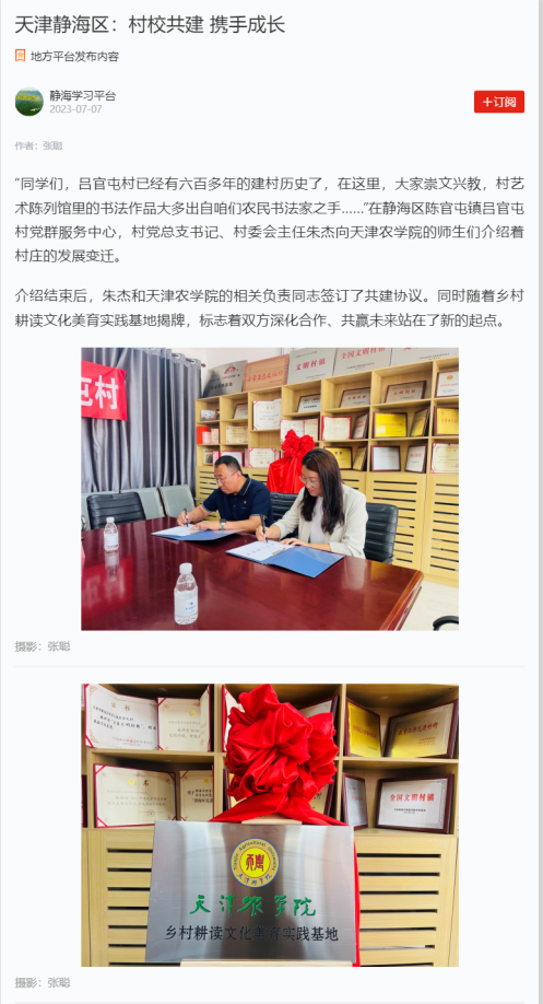 2023年7月7日,学习强国平台-静海学习平台以《天津静海:村校共建 携手成长》为题报道beat365团委与静海区陈官屯镇吕官屯村签订了共建协议并为乡村耕读文化美育实践基地揭牌,同时开展了“金句润学子”主题教育实践活动。他们将以多种方式参与和支持静海区的“三农”工作,打造务实有效的活动载体和工作项目,让广大青年学生在服务静海乡村振兴的生动实践中,厚植爱农情怀,练就兴农本领。
