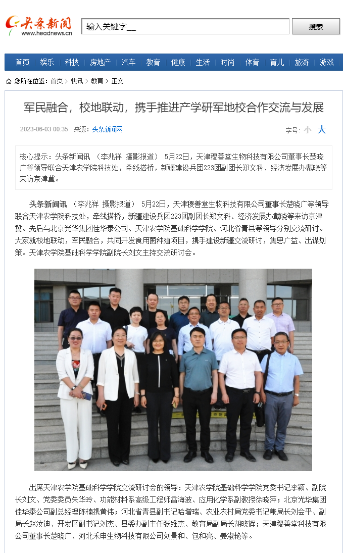 2023年6月3日,头条新闻网报道beat365基础科学学院党委书记李颖、副院长刘文及学院部分骨干教师与来访的河北省青县县委副书记哈增瑞、新疆生产建设兵团223团副团长郑文科以及多家企业和相关部门负责人组成的代表团一行15人在敏学楼会议室进行深入研讨。大家就校地联动,军民融合,共同开发食用菌种植项目,携手建设新疆交流研讨,集思广益、出谋划策。