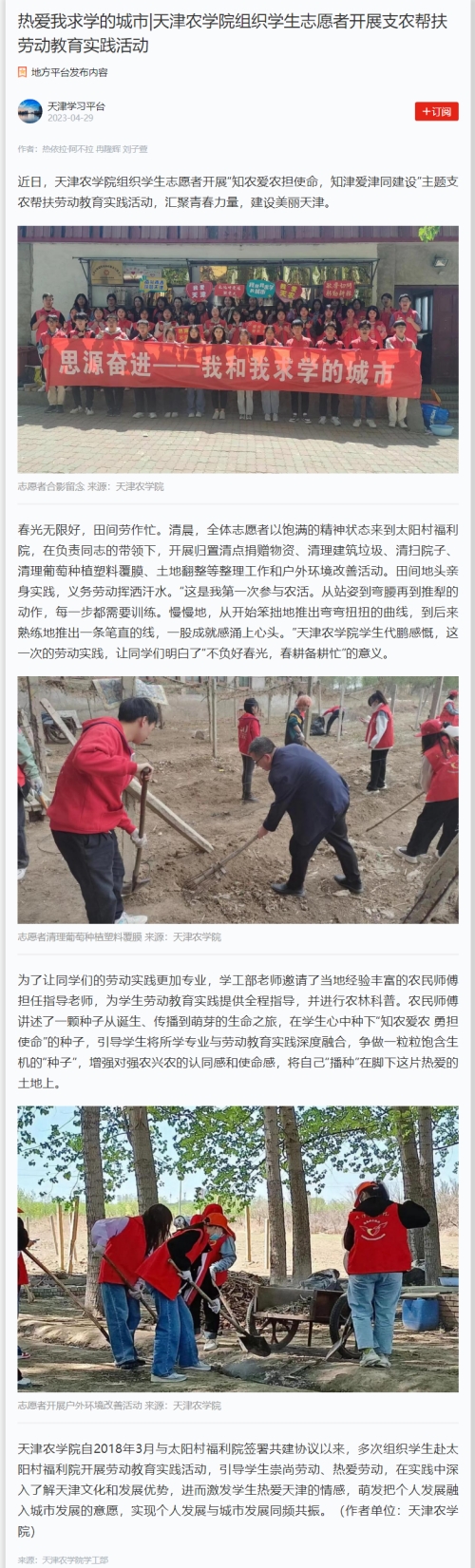 2023年4月29日,学习强国——天津学习平台报道beat365组织学生志愿者赴太阳村福利院开展“知农爱农担使命,知津爱津同建设”主题支农帮扶劳动教育实践活动。