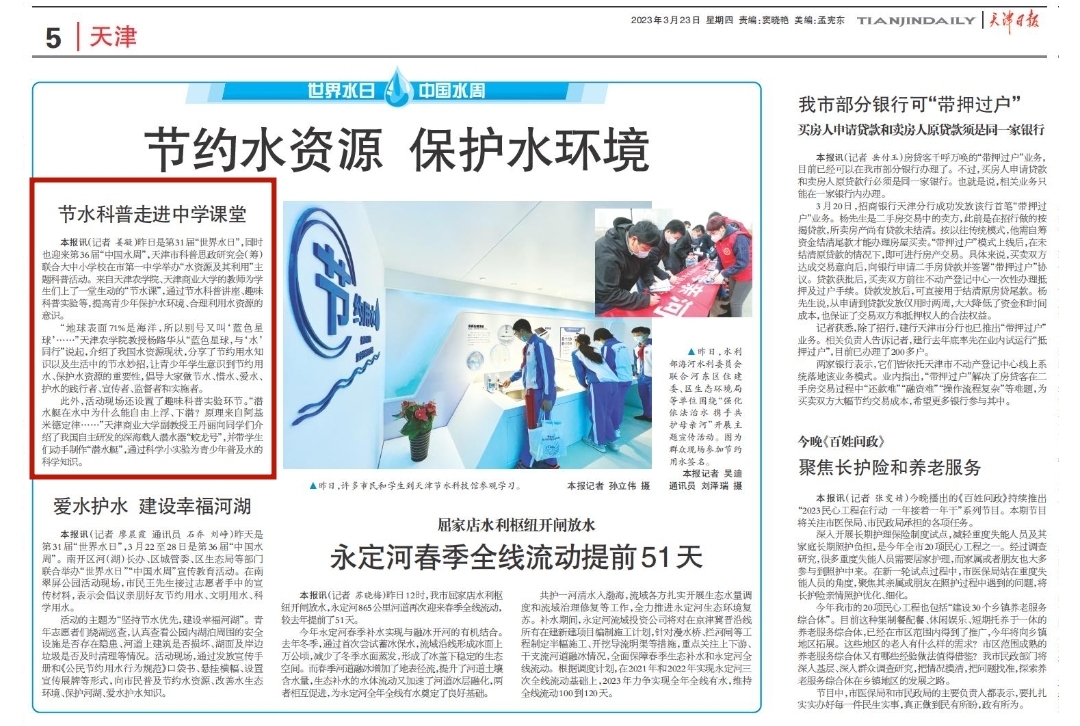 2023年3月23日,《天津日报》报道beat365水利工程学院杨路华教授走进中学课堂,进行节水科普。