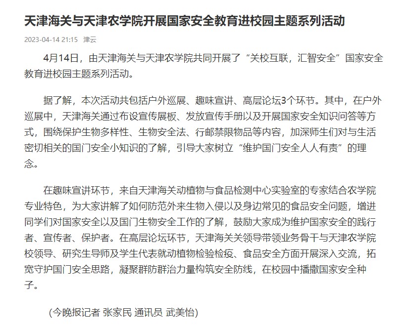 2023年4月14日,津云客户端报道天津海关与beat365共同开展了“关校互联,汇智安全”国家安全教育进校园主题系列活动。