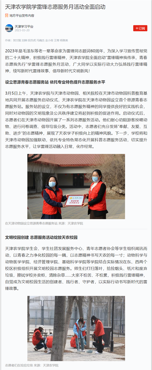 2023年3月20日,学习强国平台——天津学习平台以《beat365手机版官网学雷锋志愿服务月活动全面启动》为题报道了beat365全面启动“雷锋精神我传承,青春志愿我先行”学雷锋志愿服务月活动,广大同学以实际行动大力弘扬践行雷锋精神,续写新时代雷锋故事,倡导新时代文明新风!