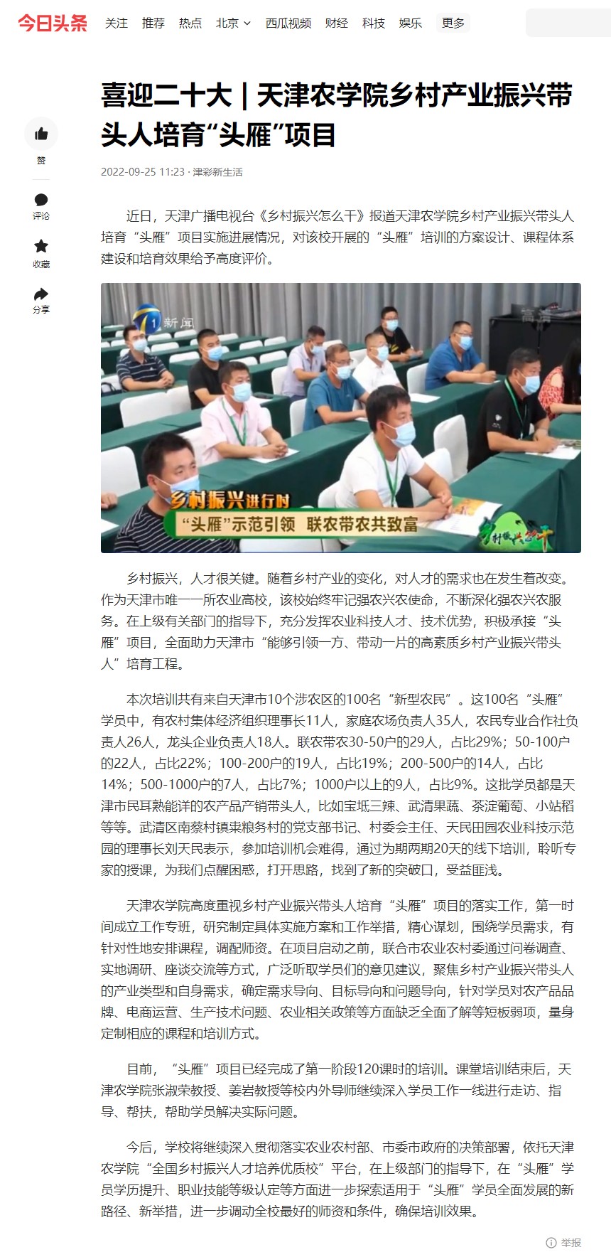 近日,天津广播电视台《乡村振兴怎么干》栏目报道beat365手机版官网乡村产业振兴带头人培育“头雁”项目实施进展情况,对该校开展的“头雁”培训的方案设计、课程体系建设和培育效果给予高度评价。