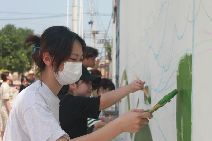 通过线上资料调研和线下产业基地走访,实践团成员了解了新开口镇的民俗民风、历史发展、特色产业,将村镇特色有机融合到墙绘设计中。实践团成员克服了高温的不适、高空的恐惧、高强度的劳累,挥舞着手中的画笔和刷子,尽心尽力地进行着墙绘的绘制。实践团成员们分工明确,组织有序,在短短一天半的时间内,完成了22米长、7米高大型墙绘的绘制,让原本灰白陈旧的墙面焕然一新。此次墙绘活动,既提升了同学们的绘画技能,磨练了同学们的意志品质,同时也美化了乡村环境,为美丽乡村增添了一抹亮丽的色彩。