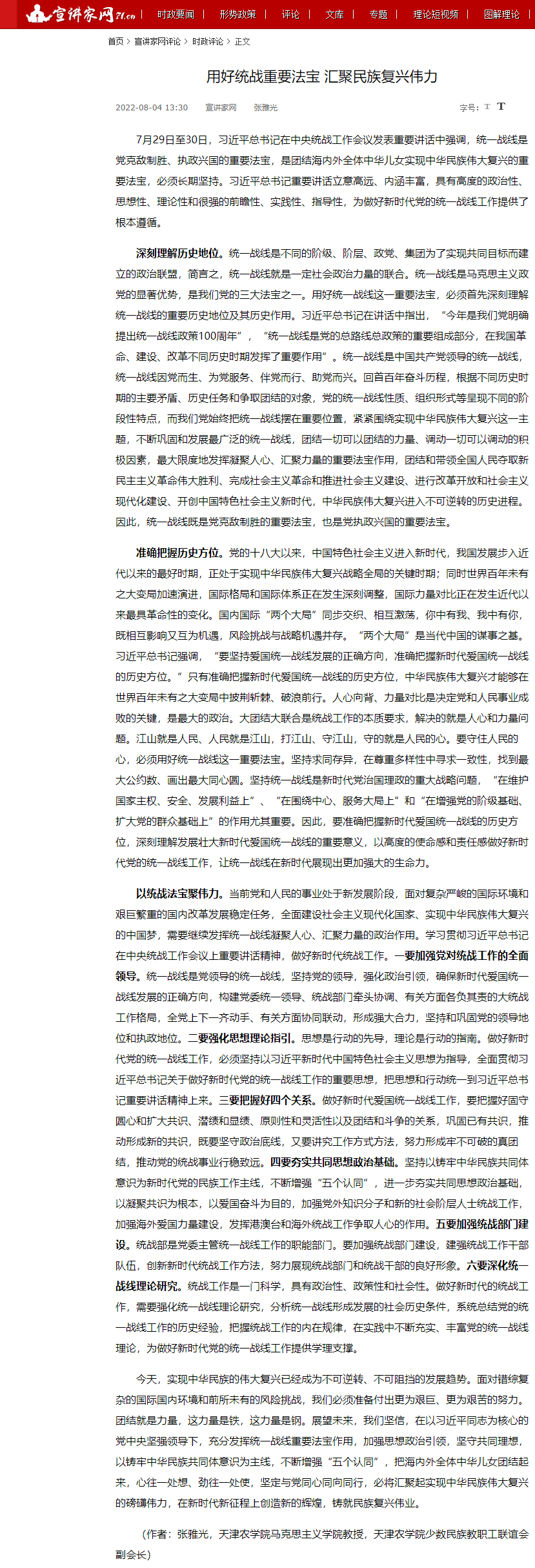 7月29日至30日,习近平总书记在中央统战工作会议发表重要讲话中强调,统一战线是党克敌制胜、执政兴国的重要法宝,是团结海内外全体中华儿女实现中华民族伟大复兴的重要法宝,必须长期坚持。习近平总书记重要讲话立意高远、内涵丰富,具有高度的政治性、思想性、理论性和很强的前瞻性、实践性、指导性,为做好新时代党的统一战线工作提供了根本遵循。