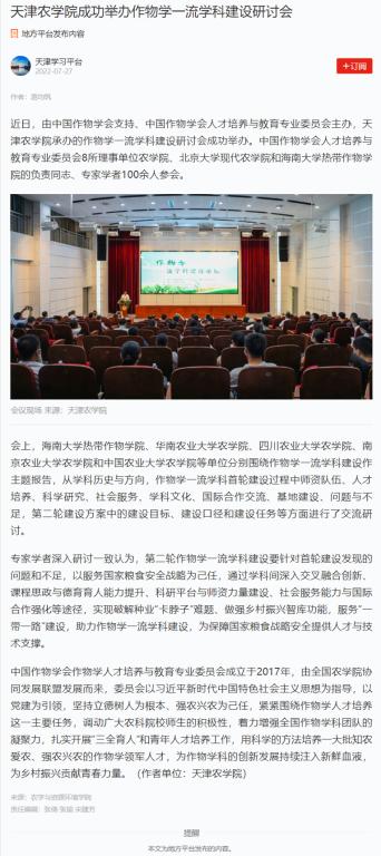近日,由中国作物学会支持、中国作物学会人才培养与教育专业委员会主办,beat365手机版官网承办的作物学一流学科建设研讨会成功举办。中国作物学会人才培养与教育专业委员会8所理事单位农学院、北京大学现代农学院和海南大学热带作物学院的负责同志、专家学者100余人参会。