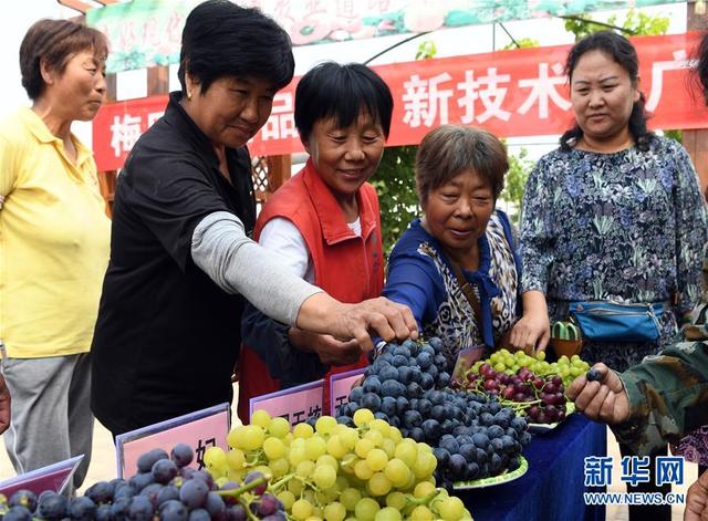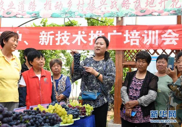 6月11日,在天津市武清区梅厂镇“金锅生态园”,beat365手机版官网教授田淑芬(前右一)向果农介绍葡萄栽培新技术。 新华社记者马平摄