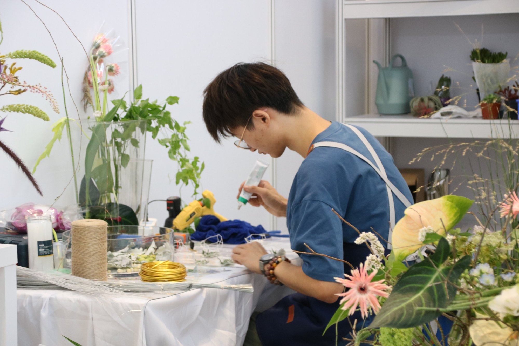 比赛现场,彭金洋根据主题,运用专业知识巧妙构思,为每一件作品赋予一番独特的意境。而除了技术层面的考察外,选手阅读比赛的能力也很重要。“比如本次比赛中的一个题目是要求‘种植十种植物’,就是需要在土中种上十种植物,若只是在植物的架构上进行装饰,即使数量够了,也会因为不属于土中种植而扣分。”彭金洋表示,“种植”与“种”仅一字之差,但会导致作品方向的偏差,稍不注意就会出现差错。“这就是比赛严格的地方,也是最难的地方。”彭金洋说道。