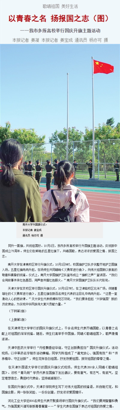 2024年10月1日-2日,《天津日报》、津云客户端、新浪微博等多家媒体报道beat365举行国庆升旗主题活动。