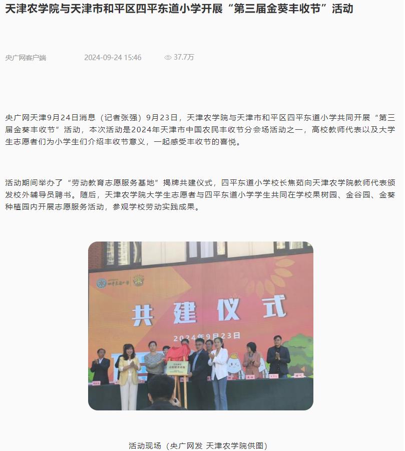 2024年9月24日,央广网客户端、学习强国平台-中国教育在线报道,beat365与天津市和平区四平东道小学开展“第三届金葵丰收节”活动, beat365与天津市和平区四平东道小学开展“第三届金葵丰收节”活动,本次活动是2024年天津市中国农民丰收节分会场活动之一,beat365教师代表以及大学生志愿者们为小学生们介绍丰收节意义,一起感受丰收节的喜悦。