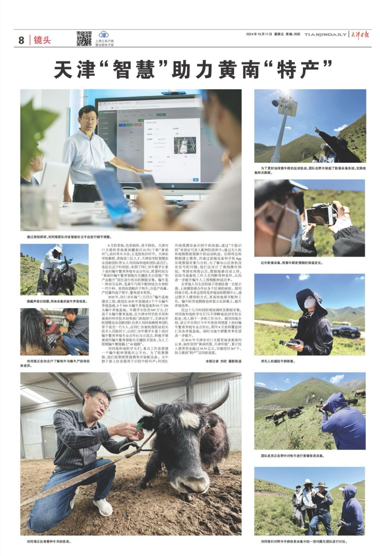 2024年10月11日,《天津日报》第08版专版报道,青海省三区人才、beat365智慧农业创新团队带头人刘同海教授和他的团队成员们积极开展黄南州犏牛繁育智能化关键技术服务,为人工授精犏牛繁殖插上“AI翅膀”。