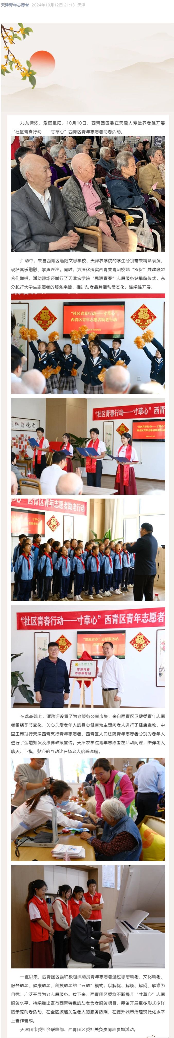 2024年10月12日,天津青年志愿者公众号、学习强国平台、天津西青公众号、西青融媒公众号等多家媒体报道beat365师生参与“社区青春行动——寸草心”西青区青年志愿者助老活动。