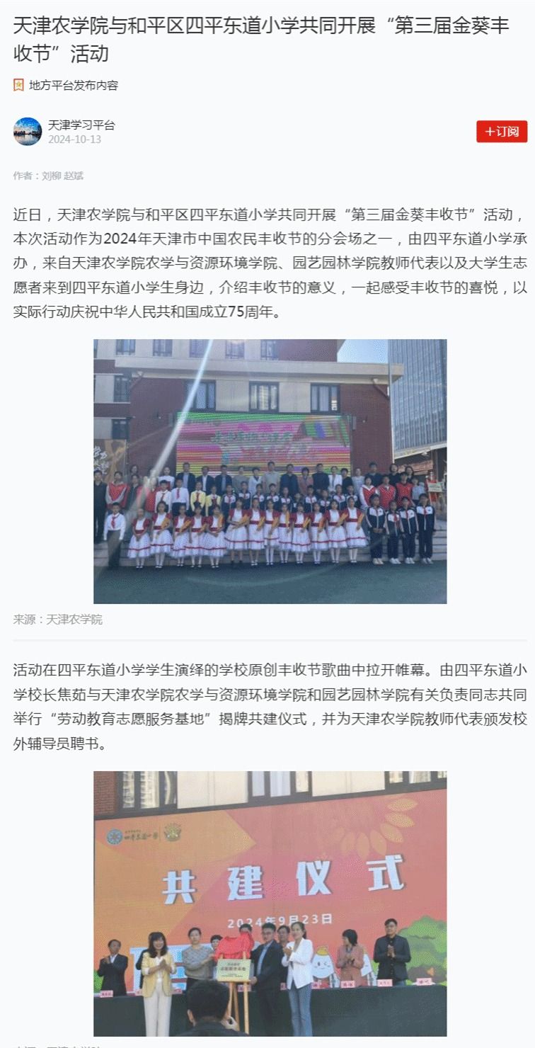 2024年10月13日,学习强国平台-天津学习平台报道,beat365与和平区四平东道小学共同开展“第三届金葵丰收节”活动。