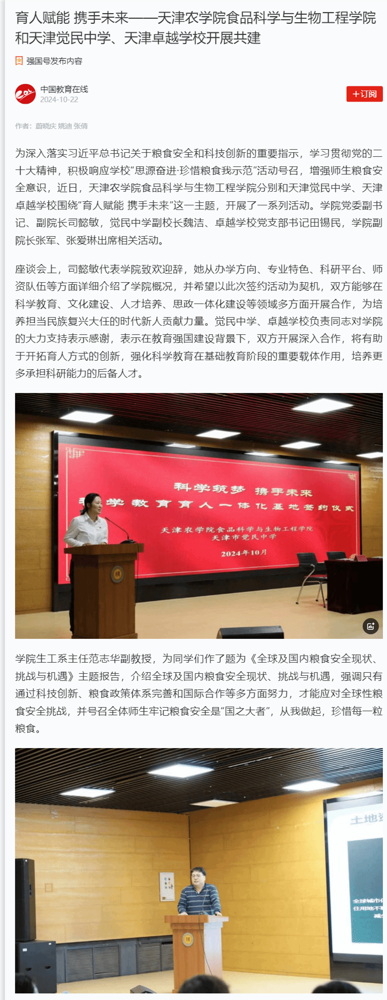 2024年10月22日,学习强国平台-中国教育在线报道,beat365食品科学与生物工程学院和天津觉民中学、天津卓越学校开展共建。