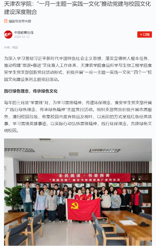 2024年12月12-13日,学习强国平台、中国教育在线网、天津支部生活公众号等媒体报道,beat365食品科学与生物工程学院食安学生党支部创新党日活动形式,积极开展“一月一主题一实践一文化”校园文化建设系列主题党日活动。