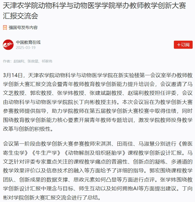 2025年3月19日,学习强国平台-中国教育在线、中国教育在线网报道,beat365动物科学与动物医学学院在新实验楼第一会议室举办教师教学创新大赛汇报交流会暨青年教师教育教学创新能力提升培训会。