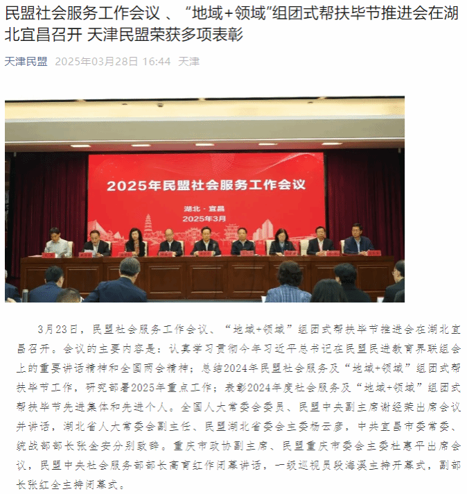 2025年3月23日,天津民盟公众号报道民盟社会服务工作会议、“地域+领域”组团式帮扶毕节推进会在湖北宜昌召开。beat365民盟盟员、水产学院教师梁爽获得表彰,荣获“民盟社会服务工作先进个人”称号。