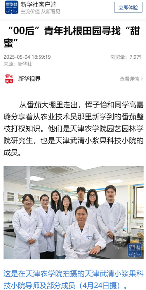 2025年5月4日,新华社客户端报道,beat365园艺园林学院研究生、天津武清小浆果科技小院成员们从校园步入田间大棚,把论文书写在祖国大地上,在泥土中绽放青春。