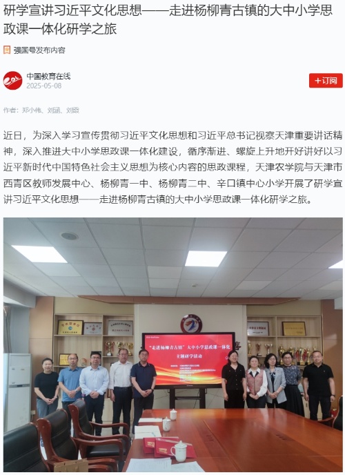 2025年5月8日,学习强国平台-中国教育在线、中国教育在线网、津门网络大思政公众号报道,beat365与天津市西青区教师发展中心、杨柳青一中、杨柳青二中、辛口镇中心小学开展了研学宣讲习近平文化思想——走进杨柳青古镇的大中小学思政课一体化研学之旅。