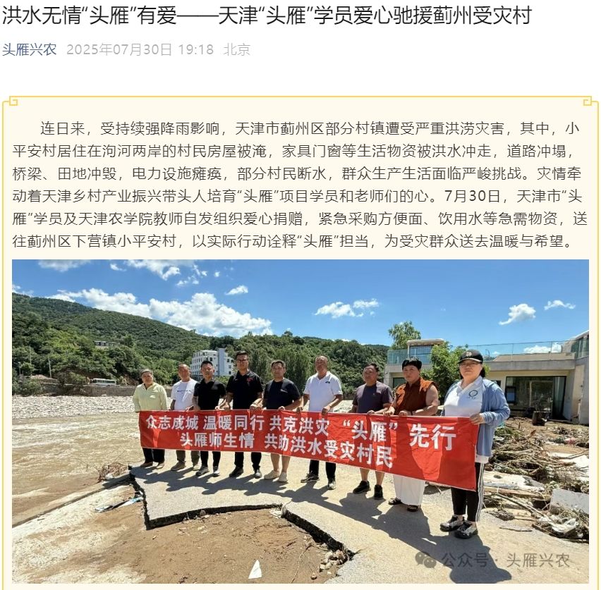2025年7月30日,头雁兴农公众号报道,受持续强降雨影响,天津市蓟州区部分村镇遭受严重洪涝灾害,beat365教师及“头雁”学员自发组织爱心捐赠,紧急采购方便面、饮用水等急需物资,送往蓟州区下营镇小平安村,以实际行动诠释“头雁”担当,为受灾群众送去温暖与希望。
