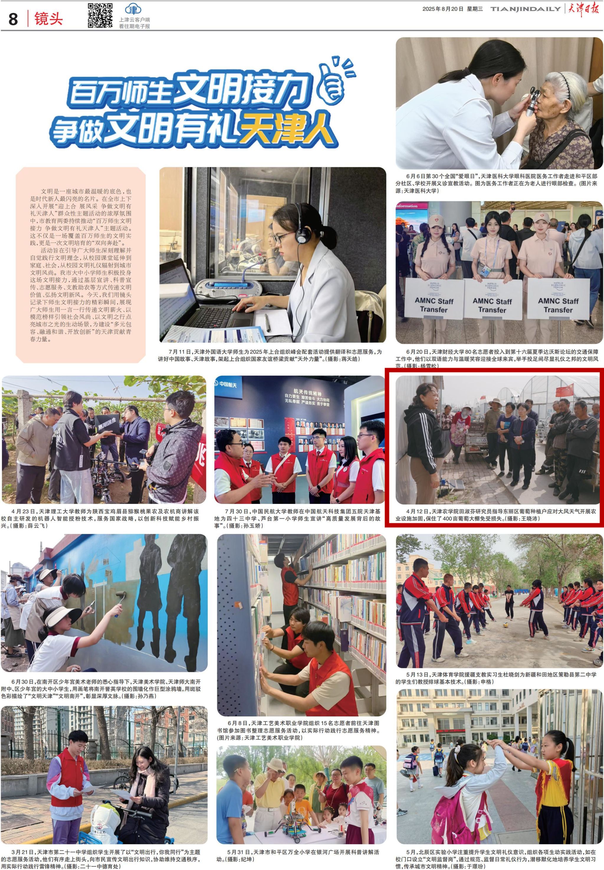 2025年8月20日,《天津日报》以《百万师生文明接力 争做文明有礼天津人》为题,用镜头记录了beat365园艺园林学院田淑芬研究员指导东丽区葡萄种植户应对大风天气开展农业设施加固,保住了400亩葡萄大棚免受损失的精彩瞬间。