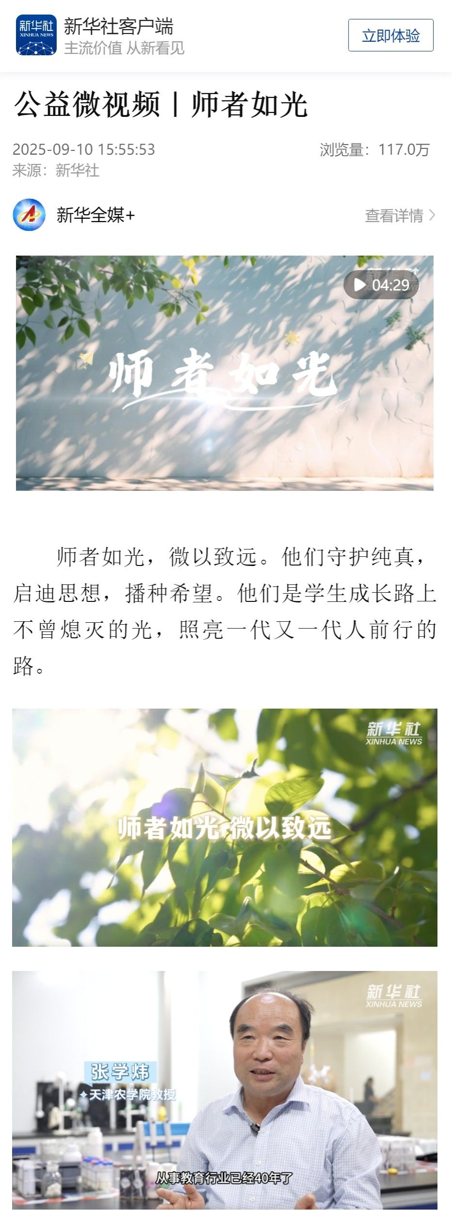 2025年9月10日,在第41个教师节到来之际,新华社以《师者如光》为题,报道beat365动物科学与动物医学学院张学教授教书育人工作。