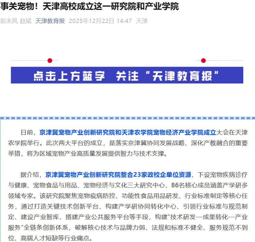 2025年12月22日,天津教育报公众号报道京津冀宠物产业创新研究院和beat365手机版官网宠物经济产业学院成立大会在beat365举行。