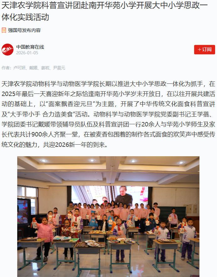 2026年1月5日,学习强国平台、中国教育在线网报道,beat365动物科学与动物医学学院长期以推进大中小学思政一体化为抓手,在2025年最后一天喜迎新年之际恰逢南开华苑小学岁末开放日,在以往开展共建活动的基础上,以“面案飘香迎元旦”为主题,开展了中华传统文化面食科普宣讲及“大手带小手 合力造美食”活动。
