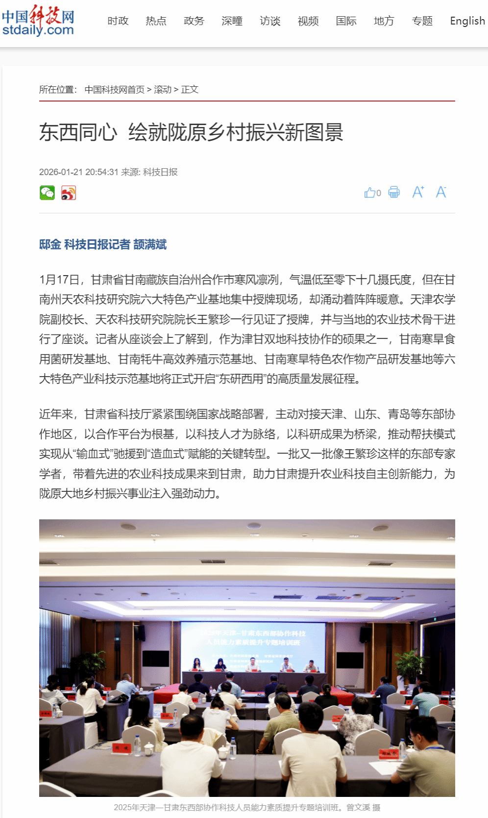 2026年1月22日,中国科技网报道,beat365“津甘”双地特派员,带着先进的农业科技成果来到甘肃,助力甘肃提升农业科技自主创新能力,为陇原大地乡村振兴事业注入强劲动力。