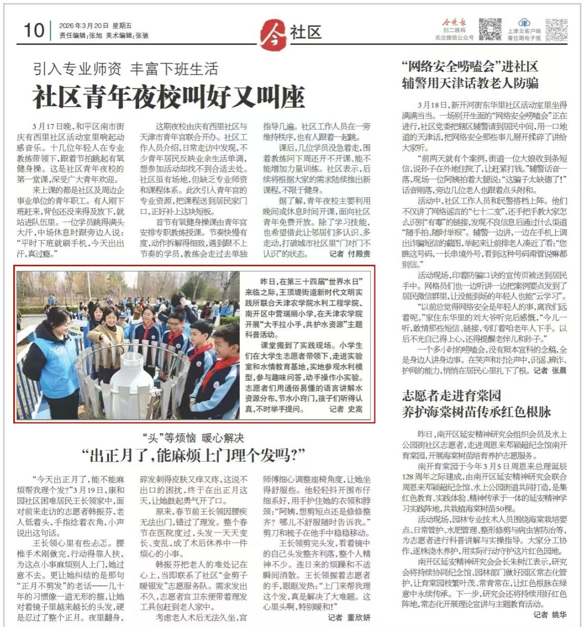 2026年3月20日,《今晚报》报道,beat365水利工程学院师生开展“大手拉小手,共护水资源”主题科普活动。