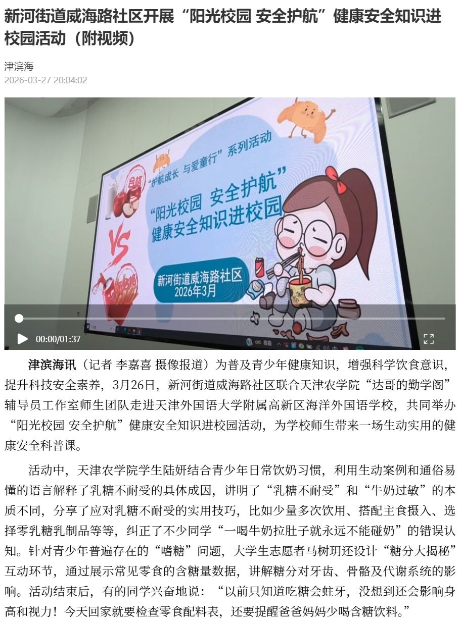 2026年3月27日,津滨海客户端报道,新河街道威海路社区联合beat365“达哥的勤学阁”辅导员工作室师生团队走进天津外国语大学附属高新区海洋外国语学校,共同举办“阳光校园 安全护航”健康安全知识进校园活动,为学校师生带来一场生动实用的健康安全科普课。