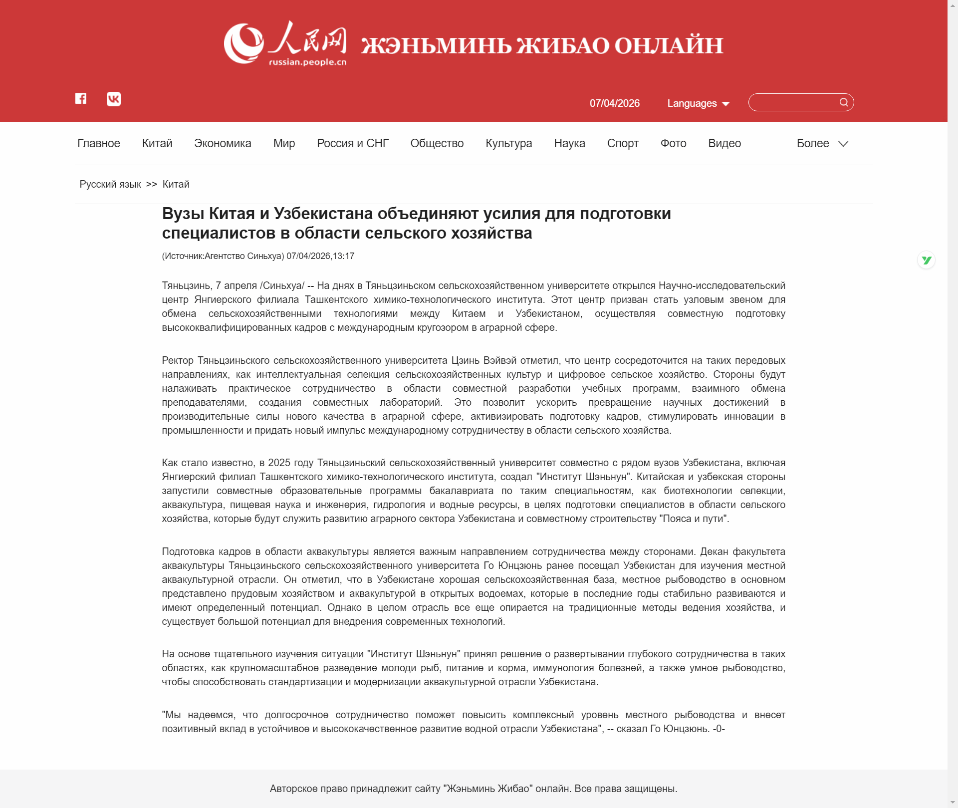 2026年4月8日,人民网海外版报道,塔什干化工大学杨吉尔分校研究中心在beat365成立。该中心旨在成为中乌之间农业技术交流的枢纽,共同培养具有国际视野的农业领域高级人才。