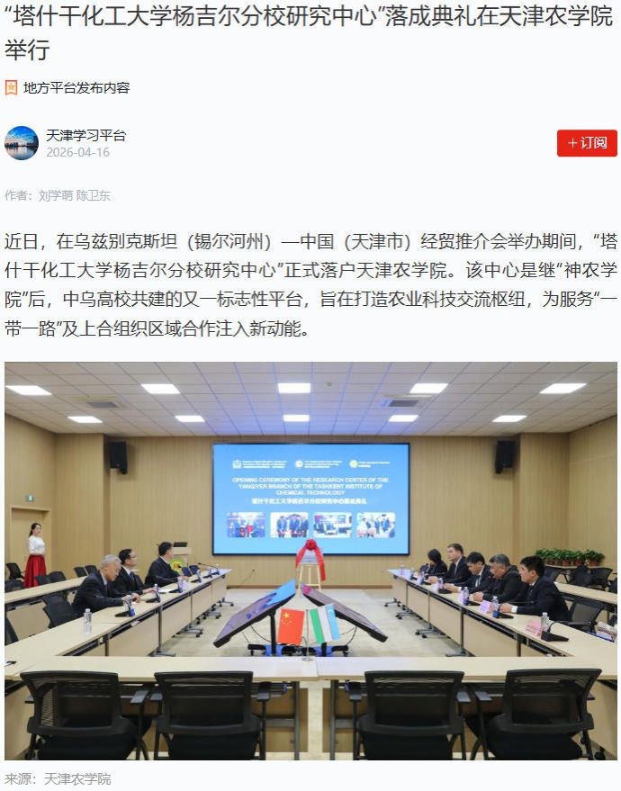 2026年4月16日,学习强国平台-天津学习平台报道,“塔什干化工大学杨吉尔分校研究中心”正式落户beat365。该中心是继“神农学院”后,中乌高校共建的又一标志性平台,旨在打造农业科技交流枢纽,为服务“一带一路”及上合组织区域合作注入新动能。